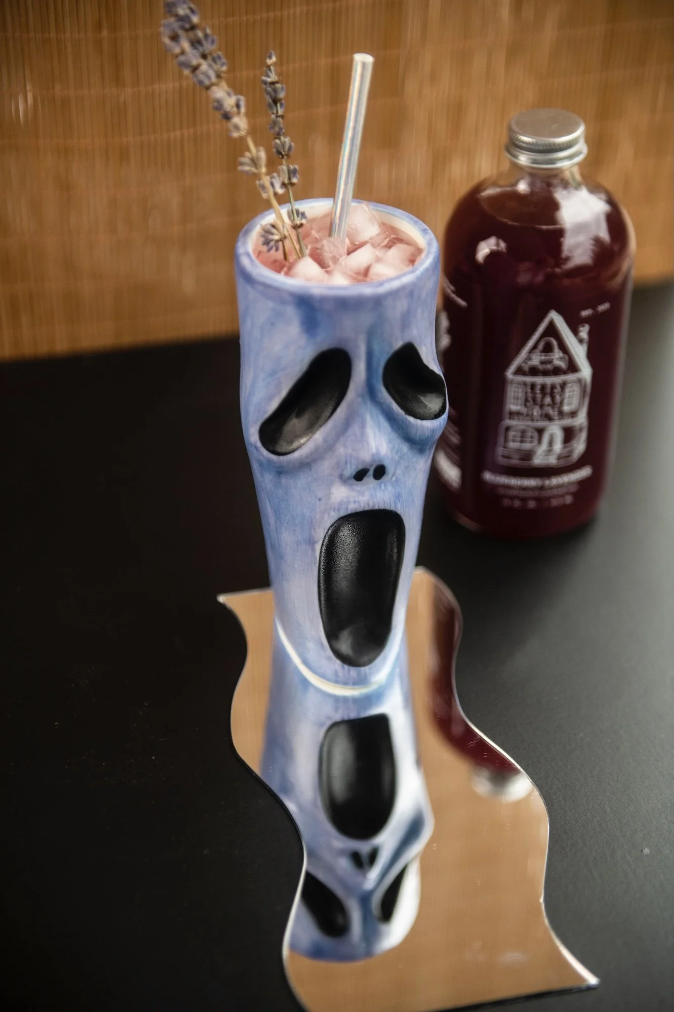 Shake or stir the all ingredients together, and pour into a glass over ice. Thematic cup and lavender garnish are optional.