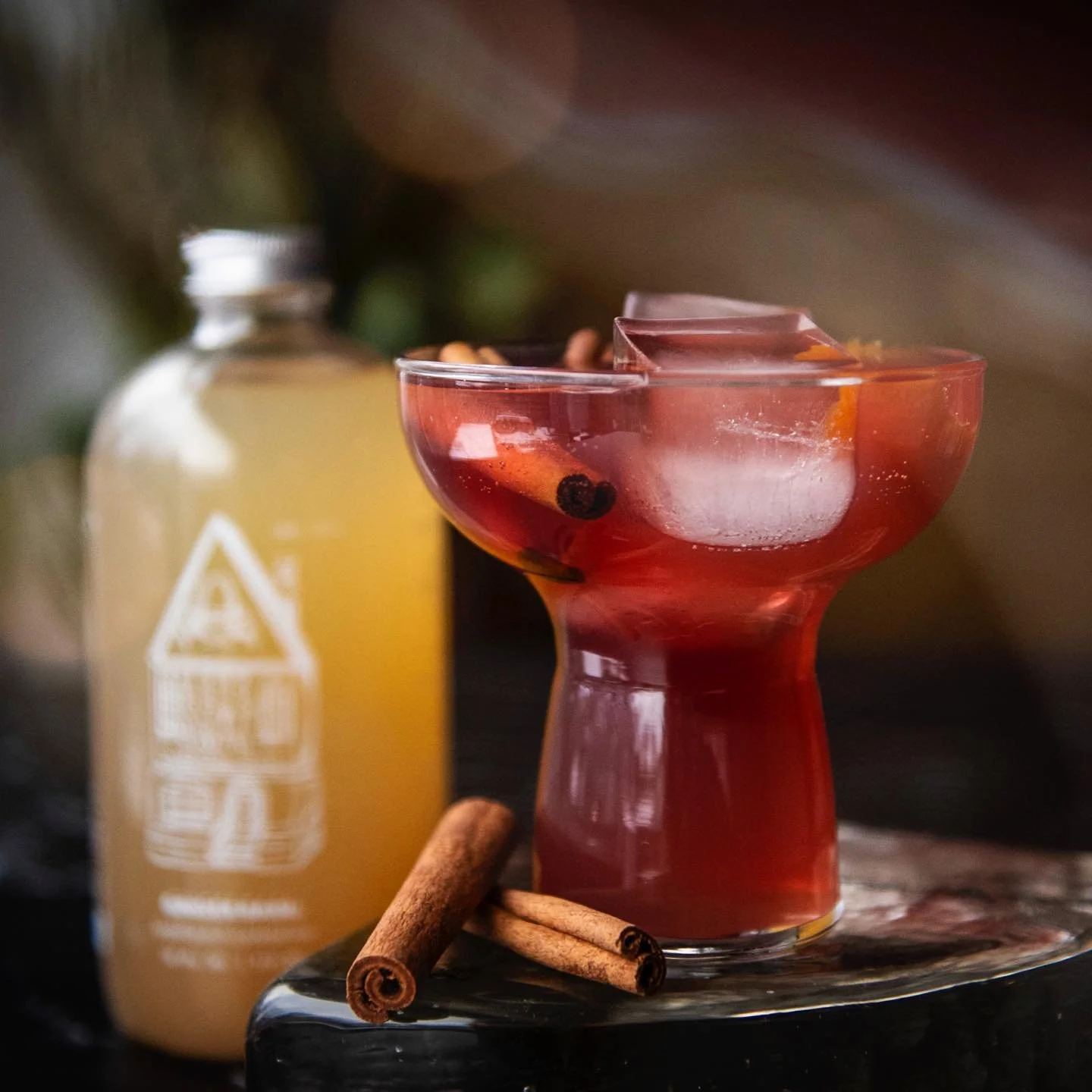 Shake or stir Ginger Basil mix, Tazo tea, and a squeeze of orange juice together. Pour over ice and top off with the sparkling water. Garnish with orange slices and cinnamon sticks. Cheers!