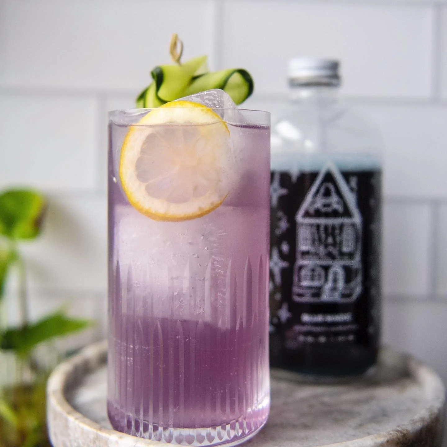 Shake all liquids together with ice and the cucumber slices. (Muddle the cucumber slices into it first for a stronger flavor.) Strain into a glass over ice. Add a squeeze of lemon juice and stir to watch the Blue Magic mix change color. Add the cucumber ribbon on top with a garnish pick. Cheers!