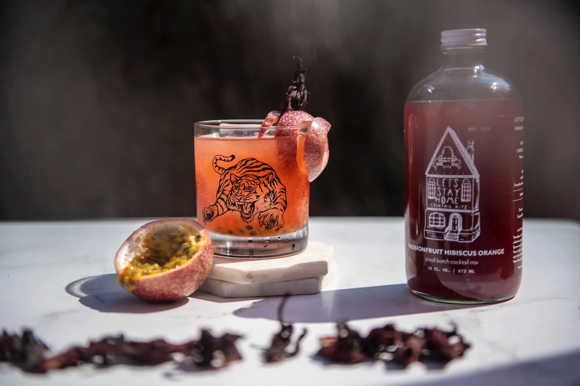 • 1.5 oz Let’s Stay Home Passionfruit Hibiscus Orange mix